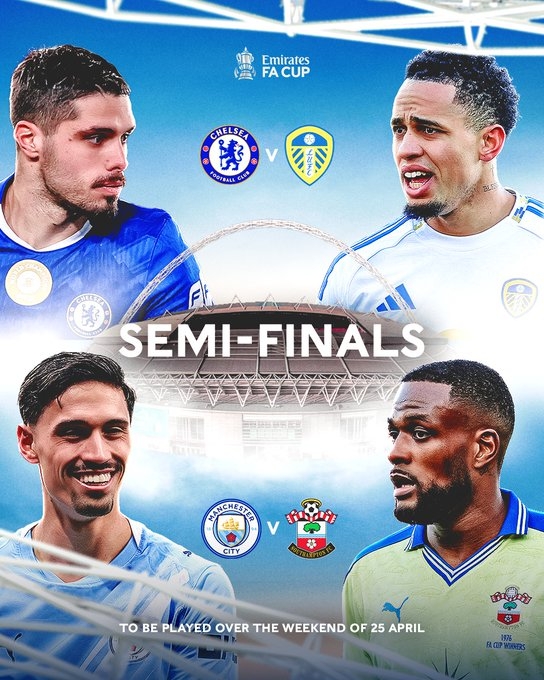 温布利开战!足总杯半决赛对阵:曼城vs南安普顿,切尔西vs利兹联