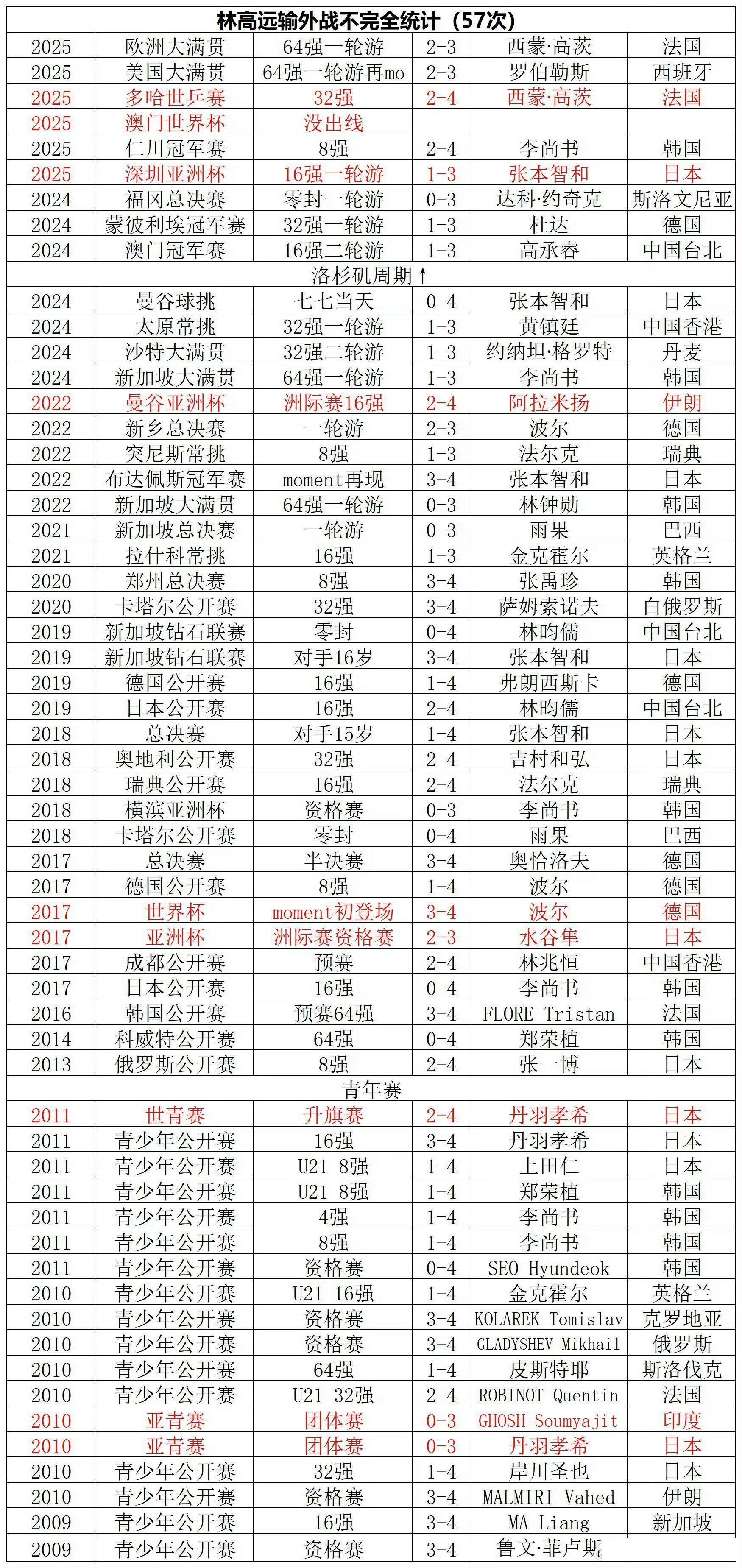 这位球迷还不完全统计,林高远自2009年青少年公开赛-2025年欧洲大满贯输外协都输了57次,他希望林高远还是更多专注球场。